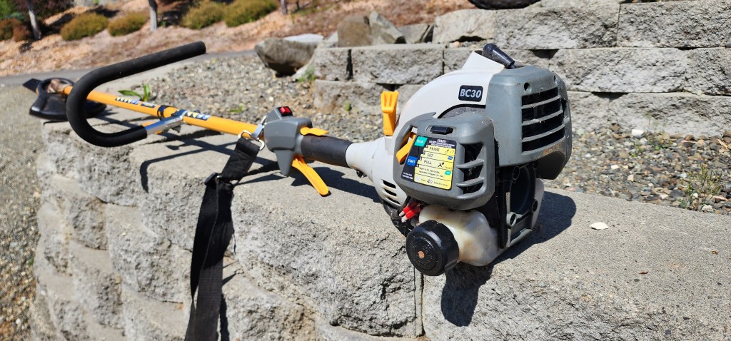 This thing, now, doesn’t mess around with plastic strings. This is a Ryobi BC30 with an invincible steel blade. It stands against the garage drinking Mad Dog 20/20’s until the weed-whackers run out of string, then it saunters down to absolutely destroy any sort of unwanted vegetation, be it blackberries or scotch broom.
