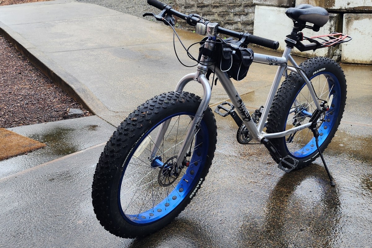 Back to the mountain bike: this is what you want, because it’s a Minnesota Framed 2.0 Fat Tire monster, which laughs at mud, snow, gravel, or sand. Try to take one of those carbon-fiber racing bikes with itty bitty thin tires through some mud, snow, or anything other than a smooth road. See how well each $5,000 wheel performs. Yeah, singular. Each wheel is $5k.