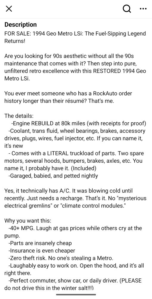 Now, the text that goes with the Geo Metro video is not as amazing, which made me sad. It’s okay.